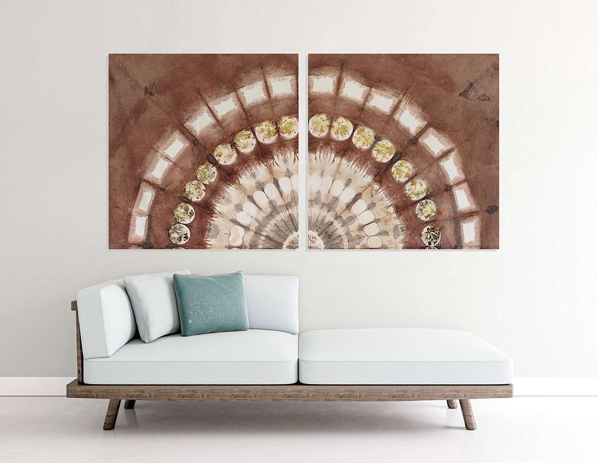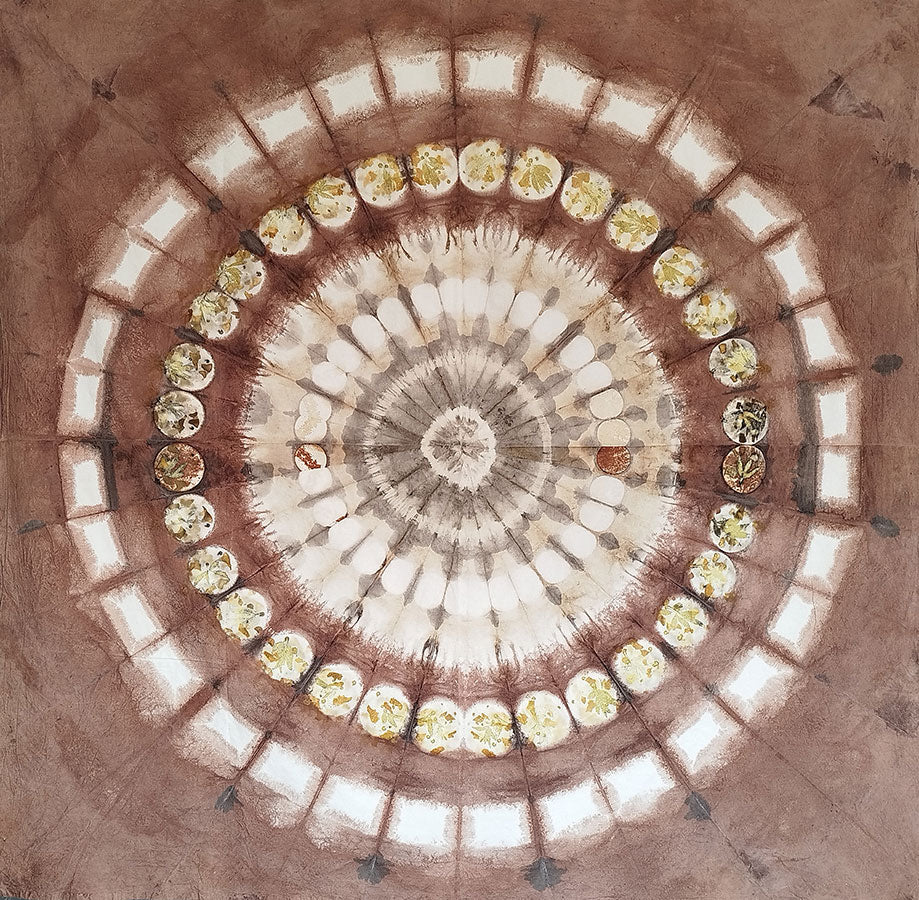 Soporte: Lienzo pesado. Técnicas: Shibori y Ecoprint. Materiales utilizados: Cáscara Nuez Pecán, Hojas de Amarillo de Río y Sarandí, Cáscara de Cebolla.