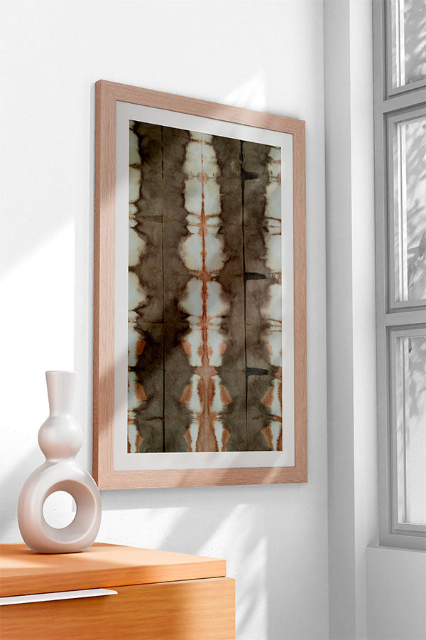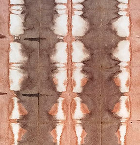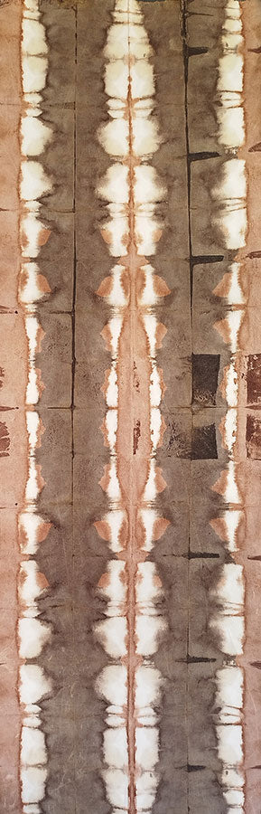 Soporte: Lienzo pesado. Técnicas: Shibori. Materiales utilizados: Cáscara Nuez Pecán y Hierro