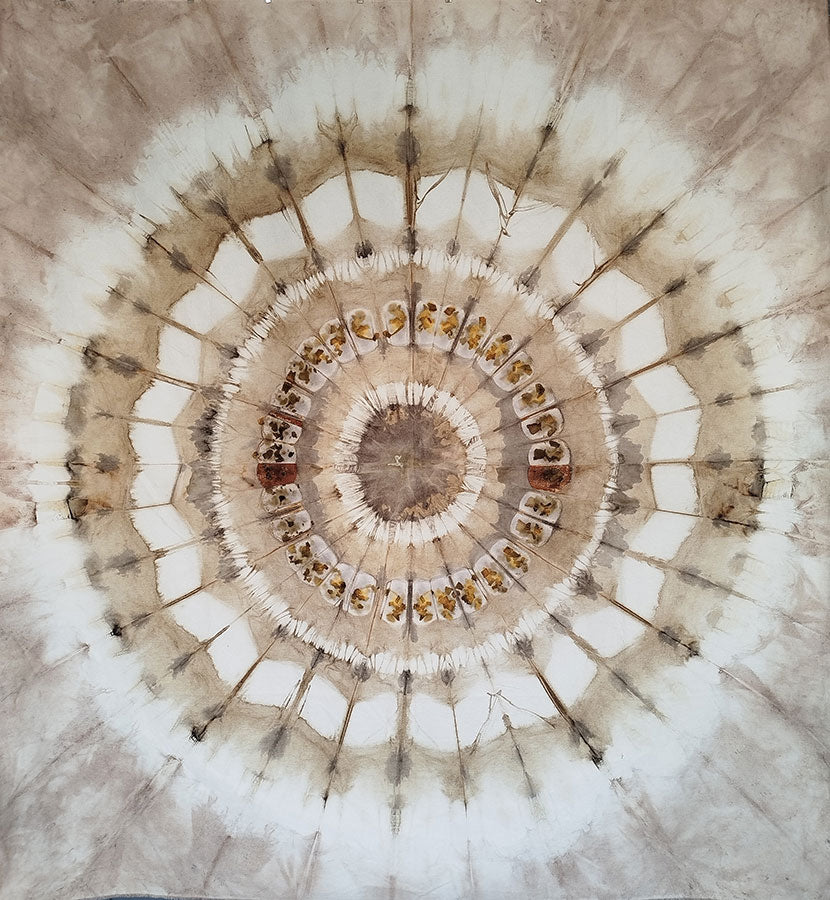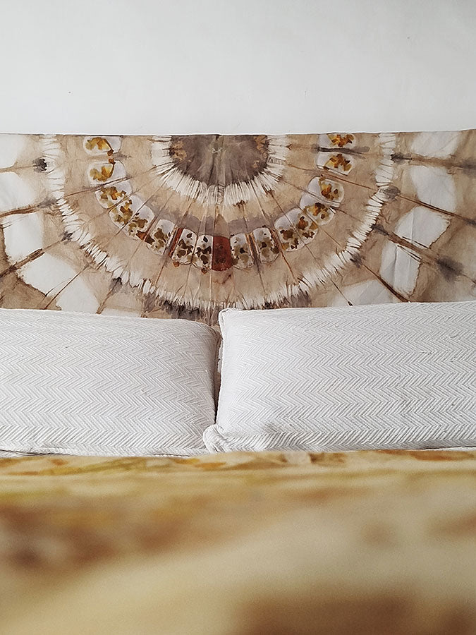 Este paño fusiona las técnicas de Ecoprint o estampado botánico y Shibori, una ancestral técnica oriental de teñido por reserva, para dar vida a un diseño atemporal inspirado en mandalas. Sus espirales de armonía evocan una conexión profunda con el Ojo de Dios, Ocal Tijuinem, en lengua Chaná.